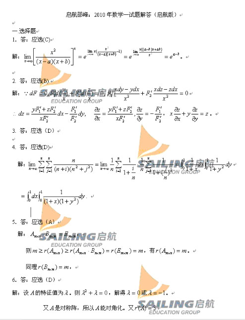 2010年数学一试题解答